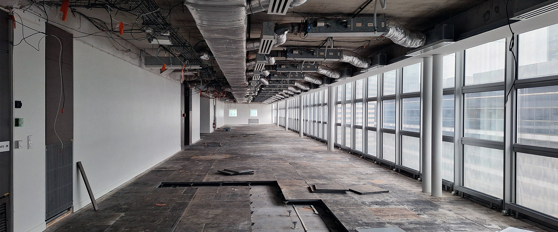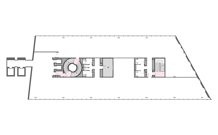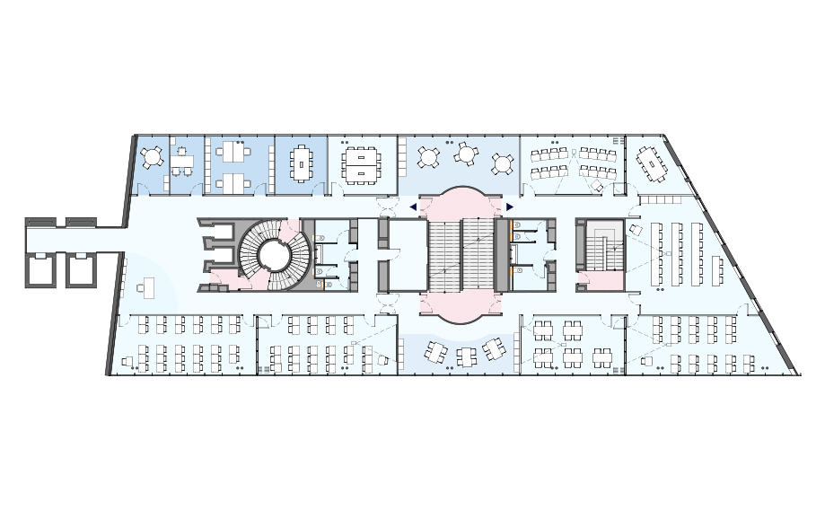 L’opération visait à densifier l’immeuble en portant chaque plateau à 200 postes. La restructuration du noyau, du compartimentage et des circulations verticales – escaliers, ascenseurs et réseaux – a permis de garantir et d’améliorer les performances, l’accessibilité et la sécurité. La réflexion globale a ouvert la possibilité d’un découpage multilocataires, chaque entité disposant d’entrées indépendantes.